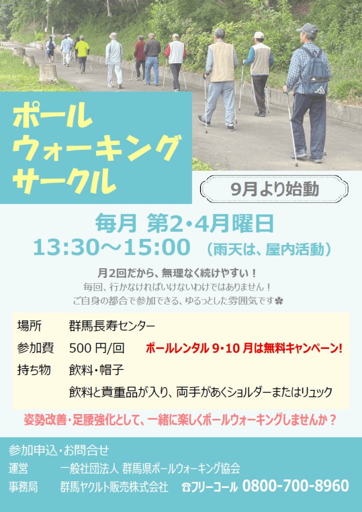群馬長寿センターを会場に、初心者・経験者問わずポールウォーキングで交流しています。まずは、正しいフォームから始めましょう!